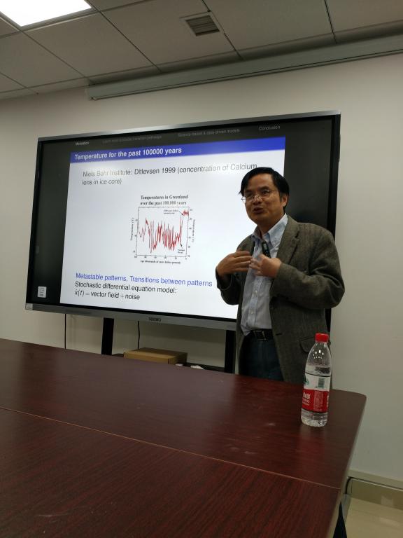 作为365英国上市公司校庆67周年学术交流周名家论坛嘉宾同时作为“数理论坛”第114期嘉宾,段金桥教授做了一场“数据科学碰上动力系统:我们可以学到什么?”的精彩报告。段金桥教授首先从基因随机表达的现象和数据出发进入主题,然后介绍了大气科学以及全球温度变化的模式和数据,进一步引出了随机微分方程及其在地球科学问题中的应用,特别针对非高斯噪声体系,结合一个双稳态模型详细阐述了如何从数据出发进行模型的学习和优化,并寻找最大可能迁移轨道。段金桥教授的报告将数据科学和不确定性及非线性动力系统问题紧密联系在一起,并总结了若干地球科学、生命科学问题研究中的数学挑战。报告加深了大家对于应用数学的认识,启发了听众对于数据科学新的思考。