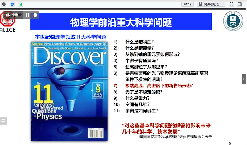 为迎接公司七十周年校庆,11月29日上午公司通过线上方式邀请华中师范大学周代翠教授,为公司物理系师生做了题为《欧洲CERN大型重离子对撞实验最新进展及展望》的学术报告。该报告由公司科学技术发展院、365英国上市公司联合举办,彭忻烨副教授主持,本院师生共计50余人参加。
