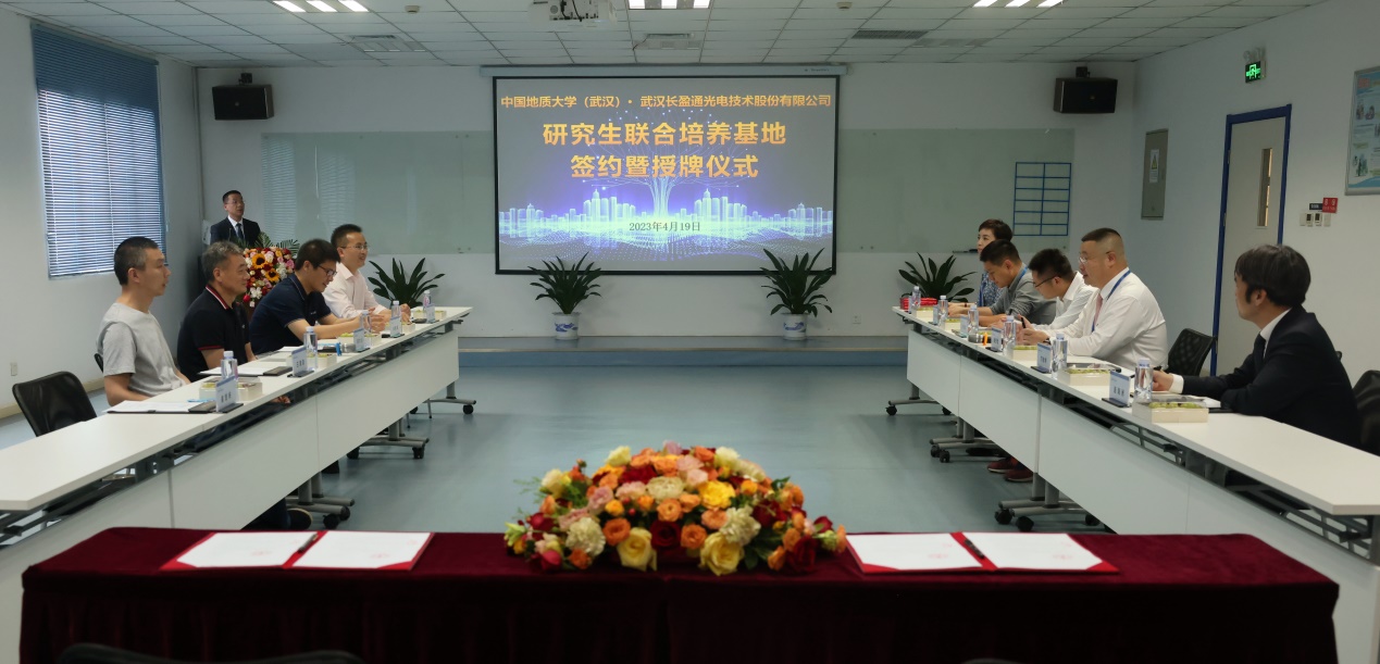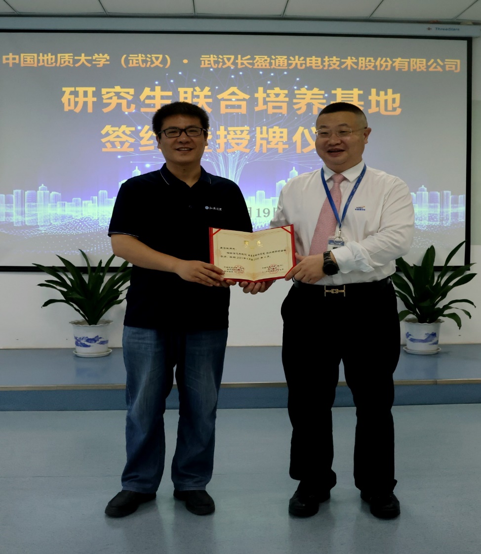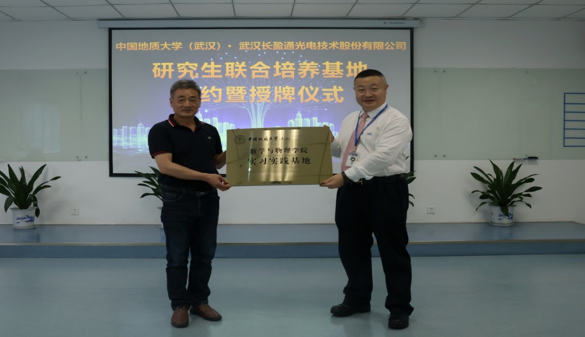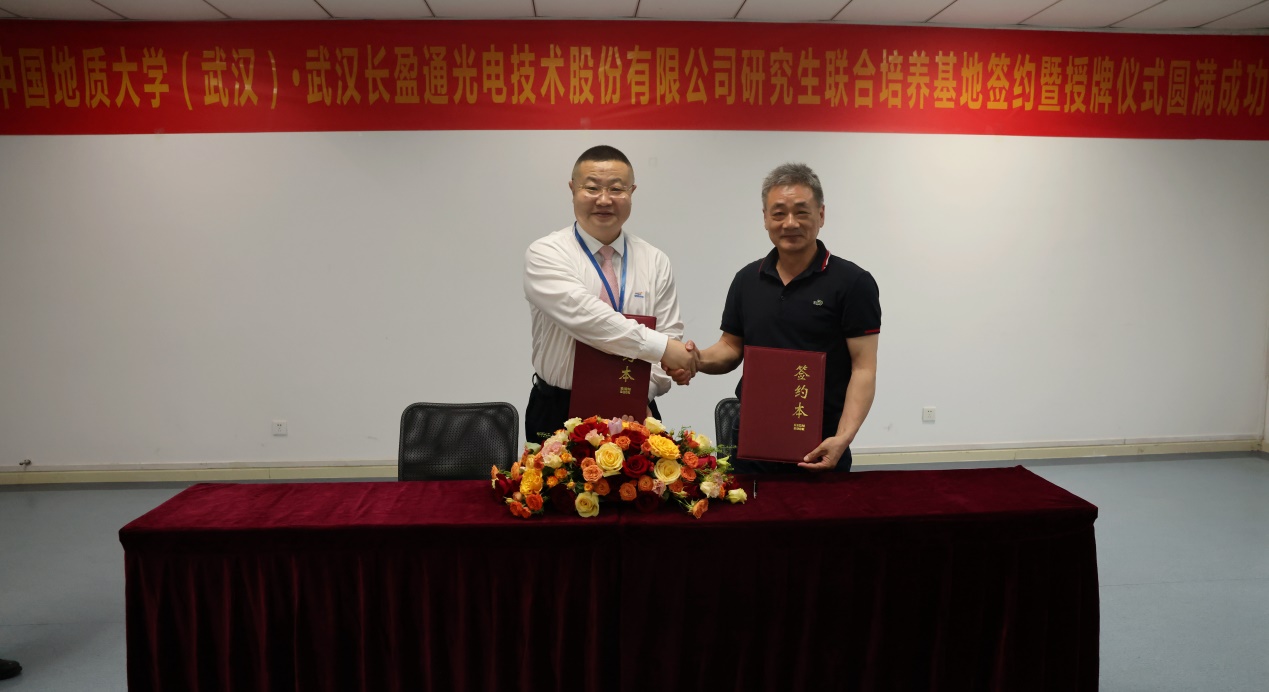 公司党委书记吴太山与武汉长盈通光电技术股份有限公司董事长兼总裁皮亚斌完成合作协议的签约仪式,并为武汉长盈通光电技术股份有限公司授予“实习实践基地”牌匾。