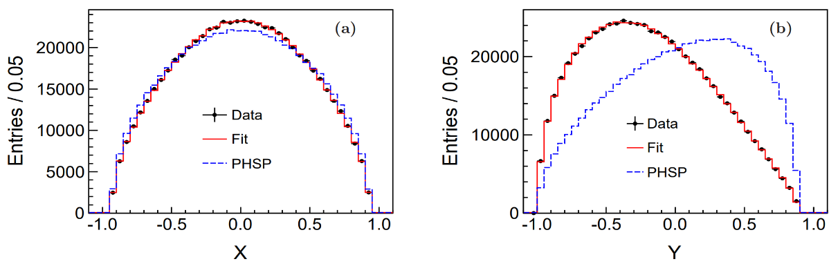 图2:(左图)η→π0π0π0中没有观测到明显的cusp效应。(右图)η′→ηπ0π0中首次观测到明显的cusp效应。