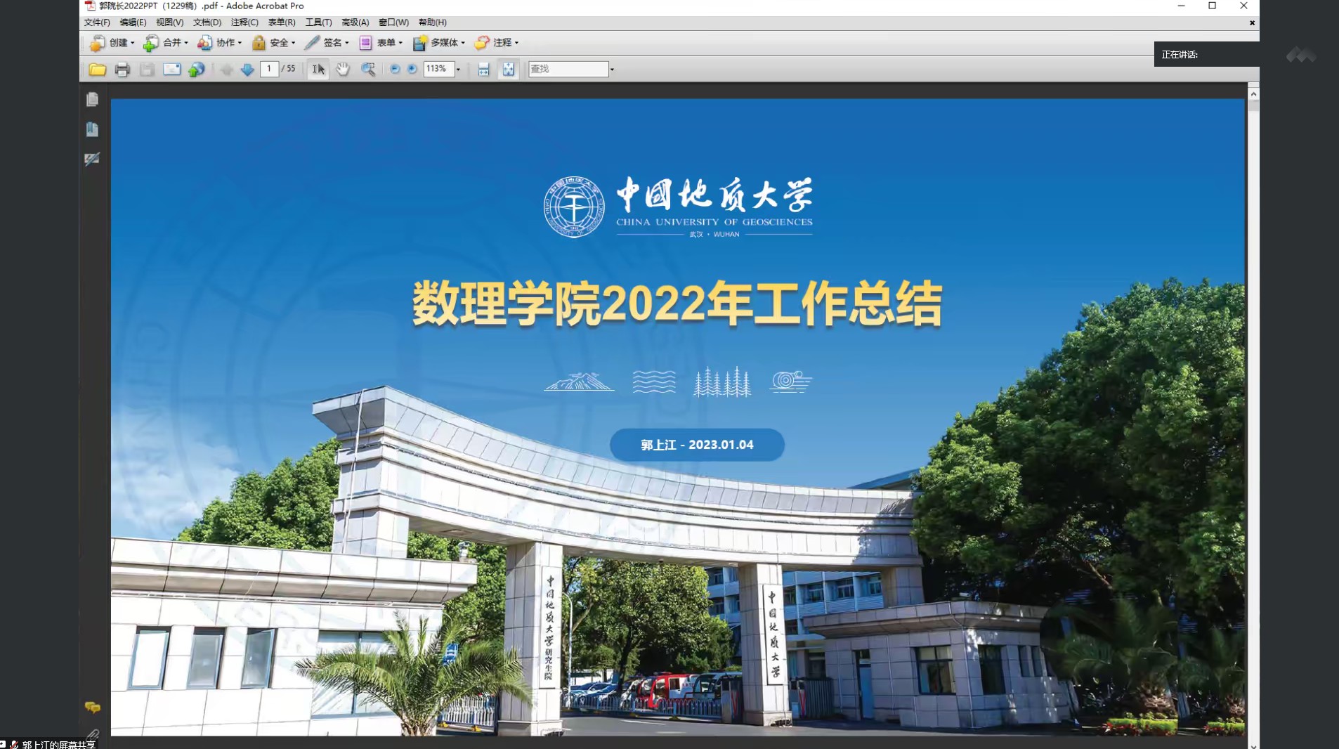 经理郭上江代表公司领导班子作了2022年工作报告。他在报告中全面总结了公司一年来的各项工作,重点介绍了在党建与思想政治工作、学科与人才队伍建设、本科教学工作、科研工作与国际交流、学位与研究生教育工作、实践教学与安全工作、员工工作、少数民族预科生教育管理工作等方面取得的突出成绩,总结凝练出团队建设迈上新台阶、科研成果亮点突显等为代表的十项标志性成绩。同时详细分析了公司“十四五”分解指标中期完成情况,提出了今后工作的难点和重点。对2023年工作进行了展望,强调要做好科技奖项和博士点申报工作。